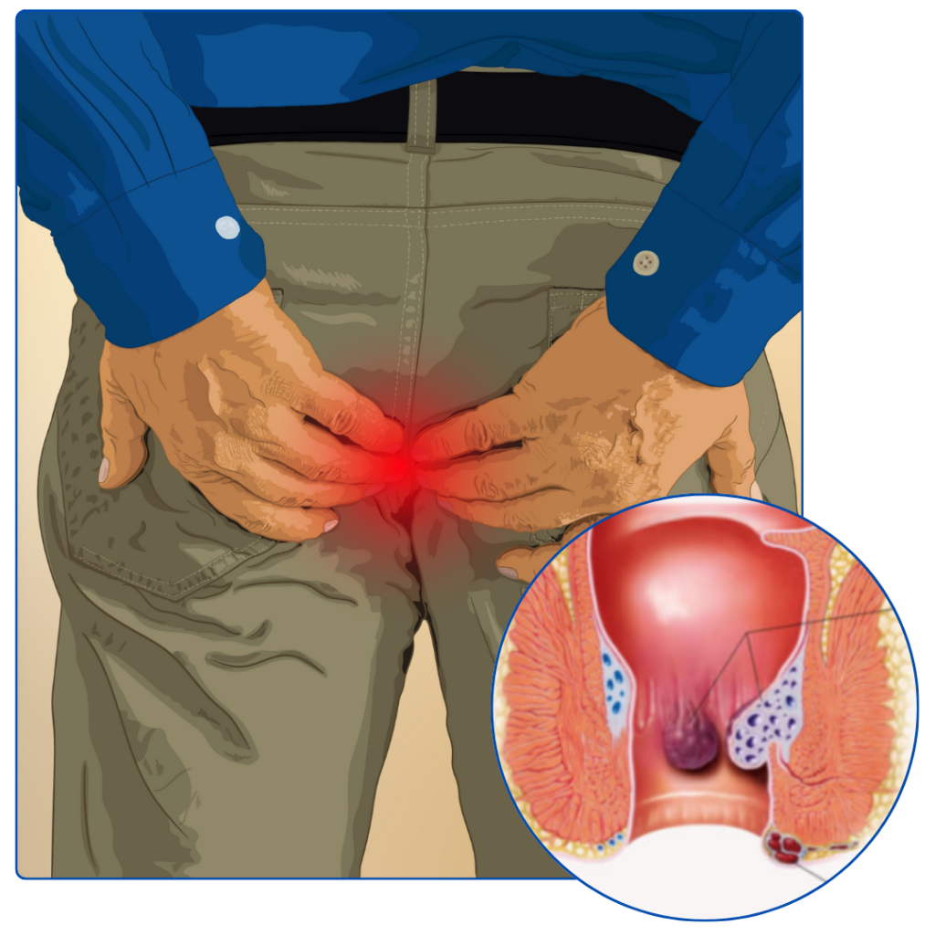 Swollen veins in the lower rectum. Symptoms include bleeding, itching, and discomfort during bowel movements.